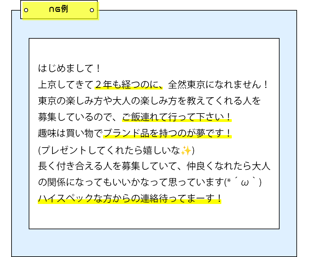 逆にNG例ではお金がかかりそう、わがままそうという雰囲気が漂ってしまっています。